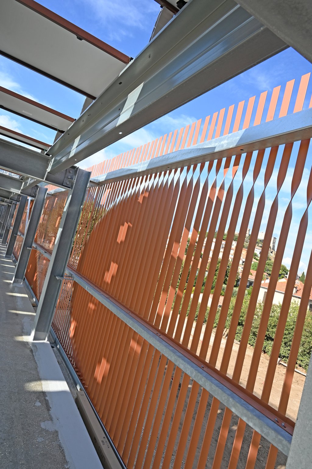 La première étape du projet cœur de ville s’achève avec l’aménagement du parking aérien à étages. Gratuit, ouvert 24/24h et 7/7 jours en accès sécurisé (système de contrôle par ticket), il est conçu sur 3 demi-niveaux (hauteur libre réduite) avec 216 places de stationnement dont 10 bornes pour véhicules électriques (extension possible). S’y ajoutent 18 emplacements pour motos et un espace dédié aux vélos. Il relève de la catégorie des parkings silo de nouvelle génération : un bâtiment en superstructure métallique largement ventilée (PLSV), plus léger, économique et moins polluant que les structures 100% béton. Une solution privilégiée pour sa sobriété énergétique (luminosité et ventilation naturelles), un terrassement moindre et une empreinte au sol réduite.
